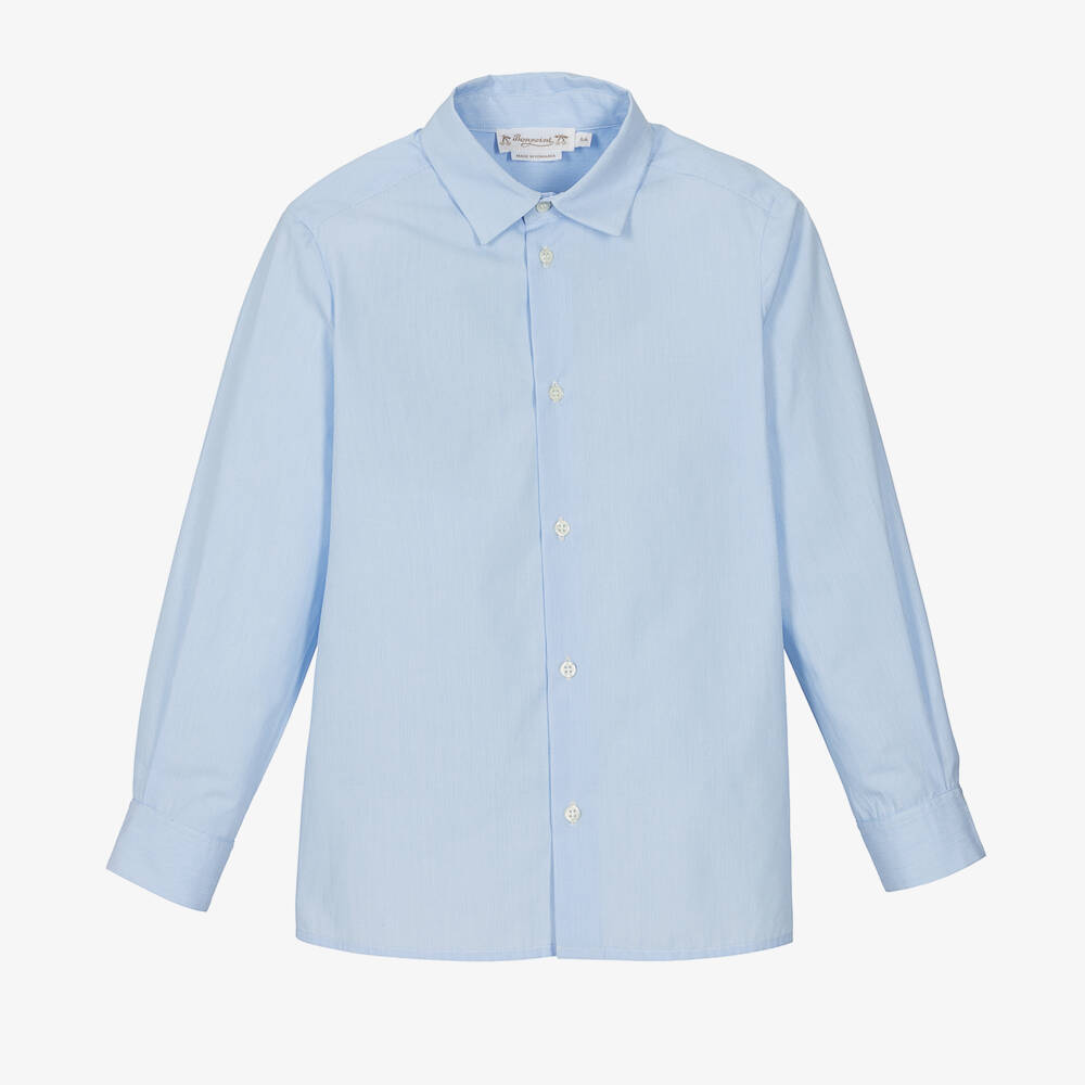 Classic blue pinstripe shirt for boys by French designer Bonpoint, woven in lightweight cotton poplin. Smart and understated, it has a pointed collar and button fastenings on the front and on the cuffs.
