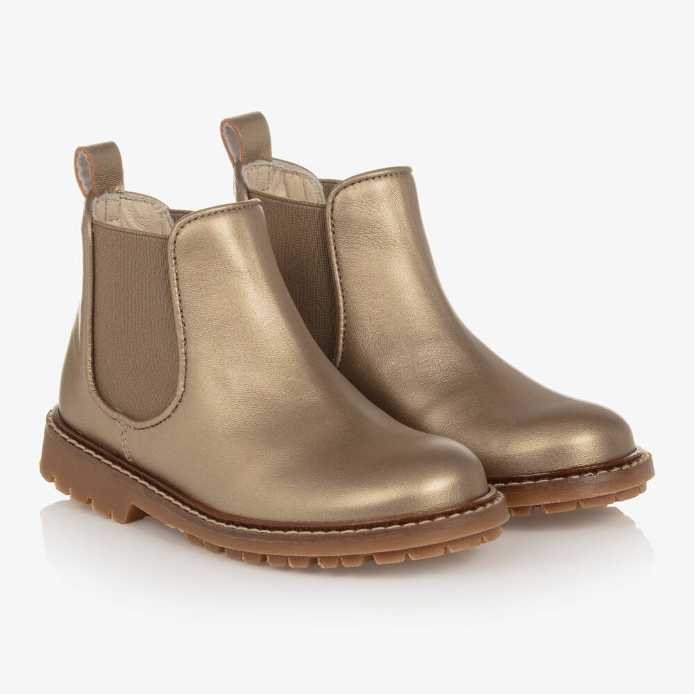Charming metallic gold boots for girls by luxury brand Bonpoint, made from the finest leather. These shimmery shoes have stretchy elasticated trims with a pull tab decorating the ankle. The chunky rubber outsole is non-slip and is neatly finished with stitching around the edge.
