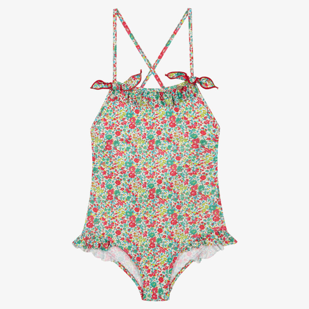 Girls green and red Liberty floral print swimsuit by luxury French brand, Bonpoint. Soft and stretchy, this practical design has frill details and crossover back straps, with a clip fastening to secure. A coordinating storage bag is included.