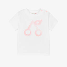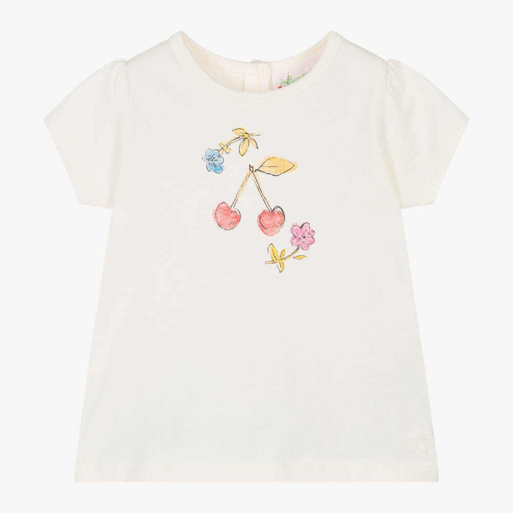 Sweet ivory T-shirt for little girls by luxury French brand Bonpoint, made in soft and comfortable cotton jersey. It has a delightful print featuring the designer's signature cherry motif alongside pink and blue flowers. Adding a pretty touch, the short sleeves are gently puffed, and the top fastens with buttons on the back.