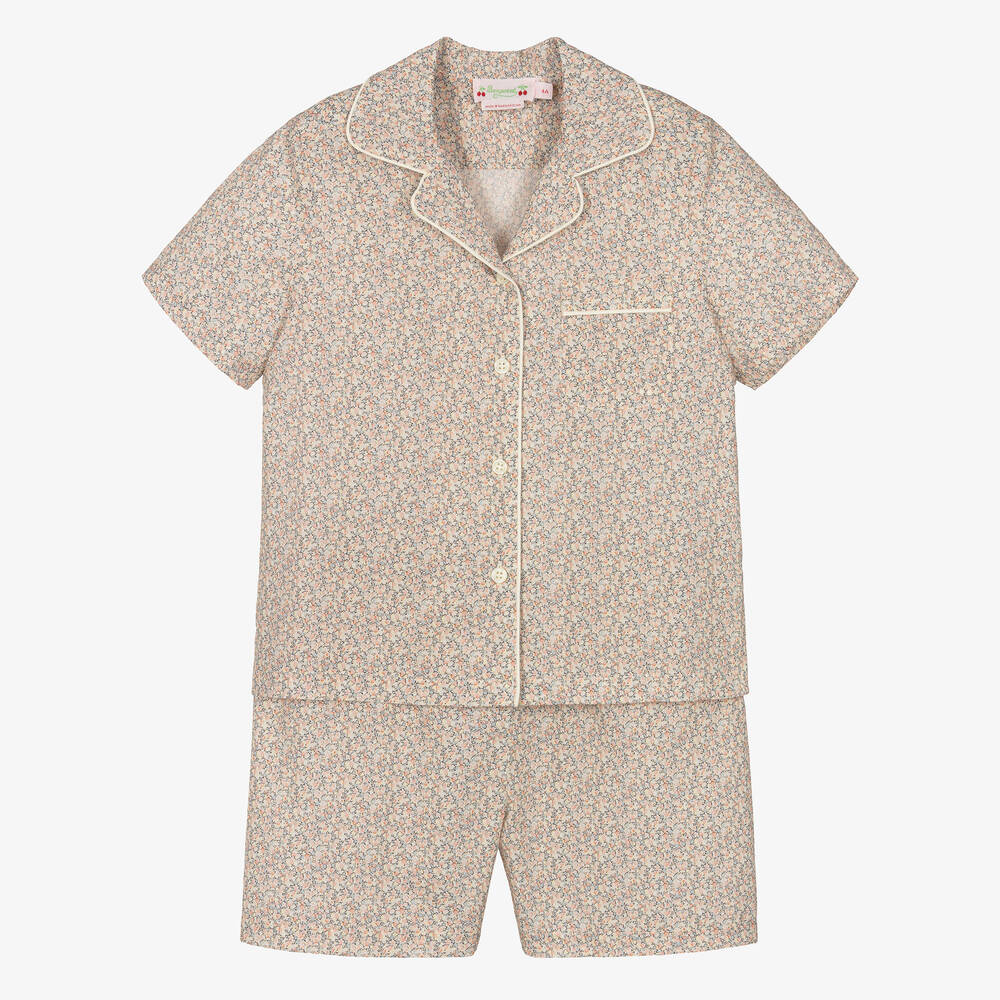 Lovely pink and blue Liberty print short pyjamas for girls by French brand Bonpoint. Inspired by the adult collection, they are made in beautifully soft and lightweight Tana Lawn cotton with a ditsy floral print. The short-sleeved top has ivory piping on the traditional, revere collar and chest pocket, which is embroidered with the signature cherry logo in ivory. There are button fastenings on the front and a comfortable, gently elasticated waistband on the shorts. The pyjamas come with a matching storage bag.