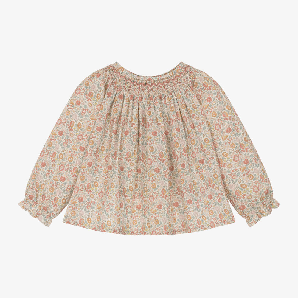 A lovely pink and blue blouse for little girls by French brand Bonpoint, made in organic Tana Lawn cotton for a beautifully lightweight feel. Patterned with a floral Liberty print, it has pretty zigzag smocking around the neckline and pearlescent buttons on the back. The long sleeves end with elasticated frill cuffs for added comfort.