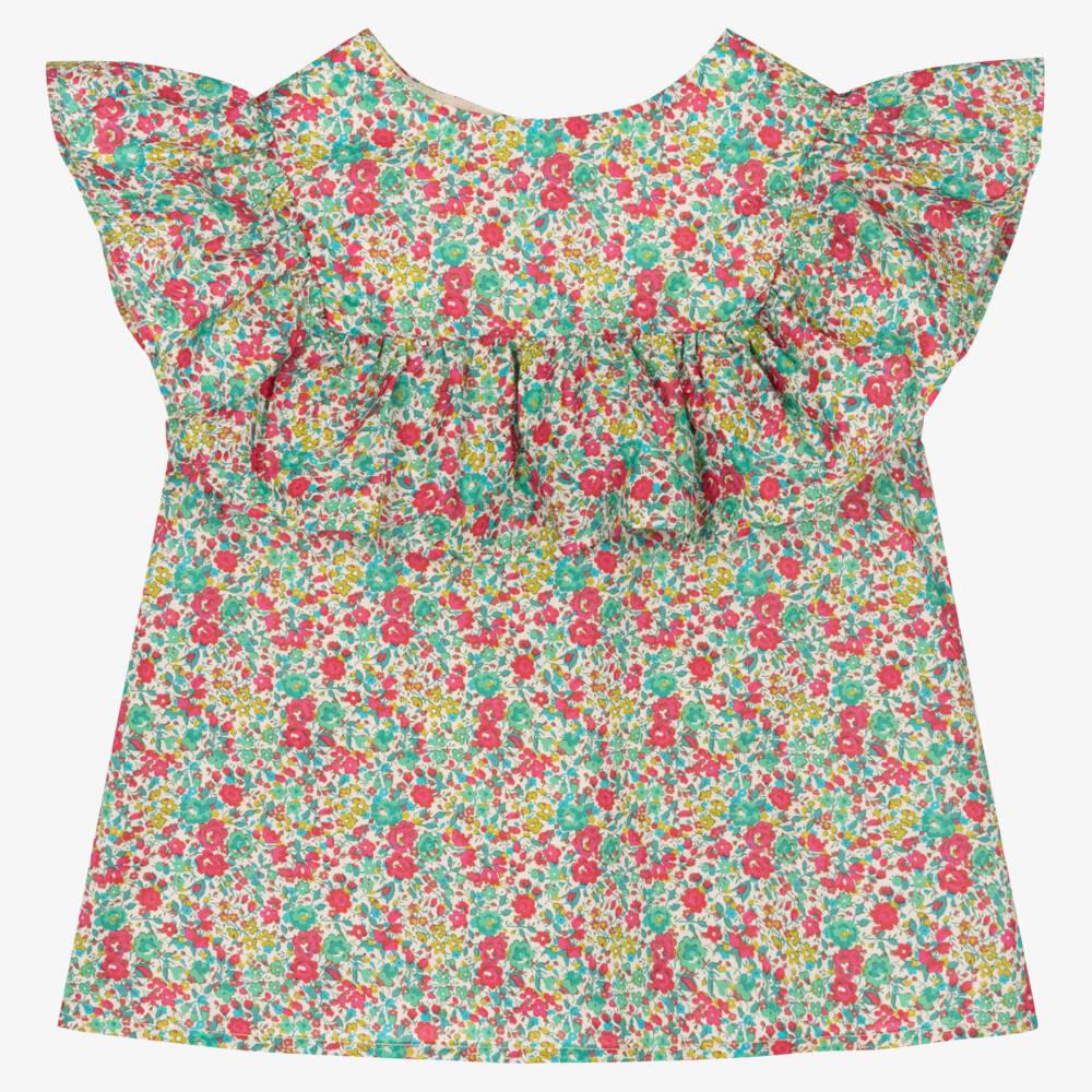 Girls red and green Liberty floral print blouse by luxury French brand, Bonpoint. Made in soft Tana Lawn™ organic cotton, the delicate ditsy floral print is printed all over. There is a frill detail and dainty mother-of-pearl button fastenings on the back.