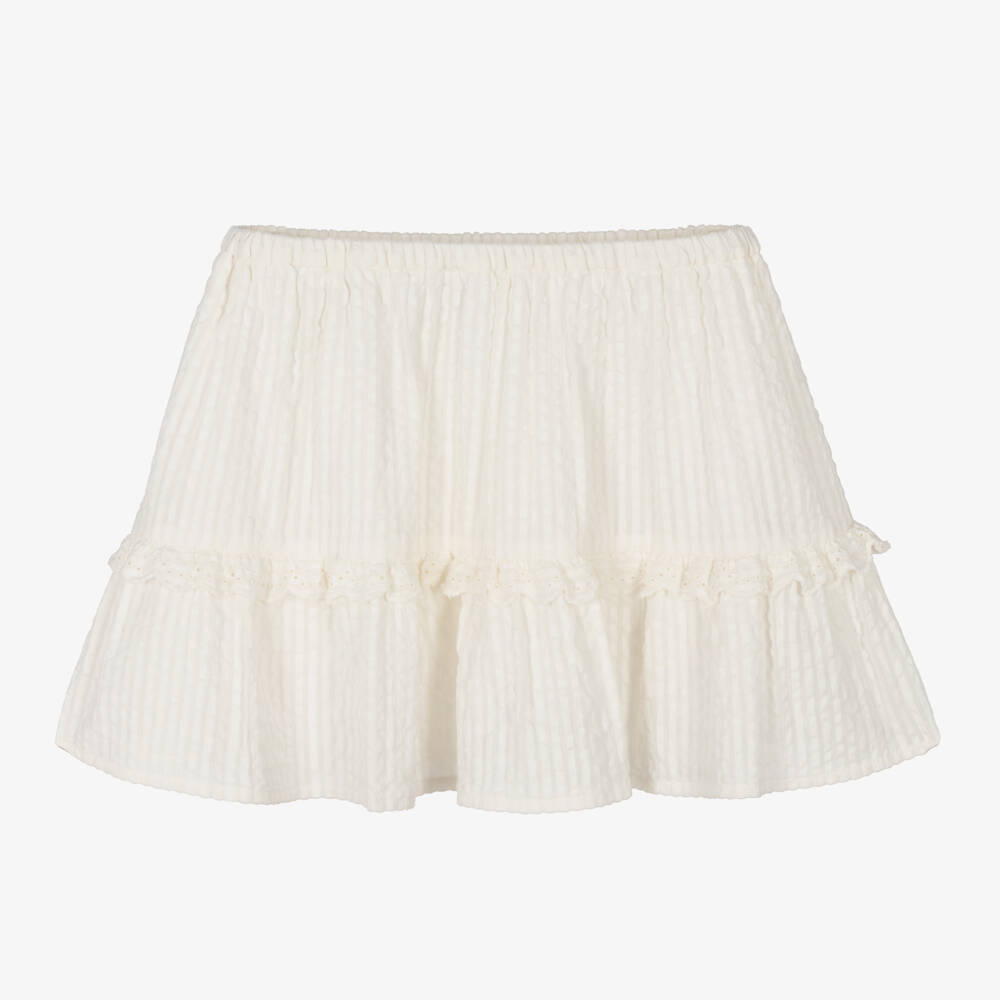 From luxury French brand Bonpoint, a white skirt for girls made in soft cotton seersucker. With an elasticated waist for comfort, it has tiers for a voluminous shape and beautiful broderie anglaise lace trim around the middle for a pretty finish.