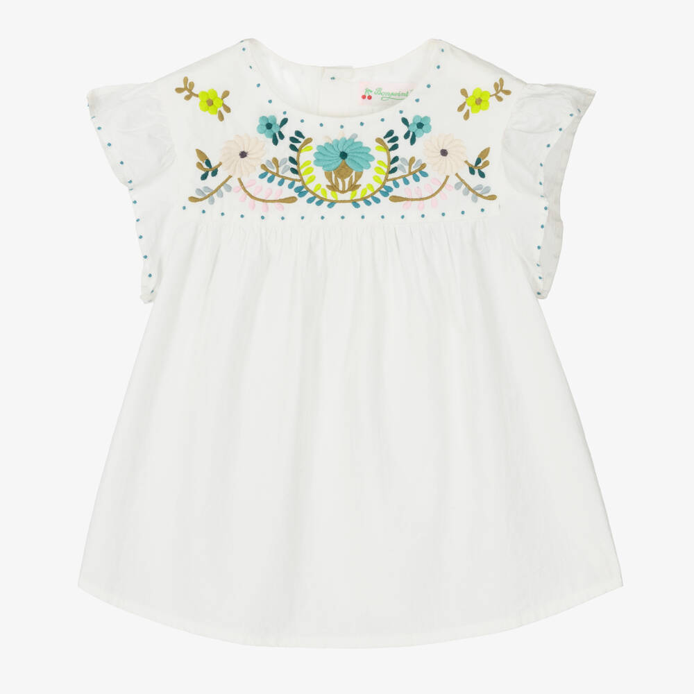 Pretty white blouse for girls, by luxury French brand Bonpoint. Lightweight and loose fitting for warmer months, it has intricate floral embroidery on the bodice, frilled sleeves and pearlescent button fastenings on the back.