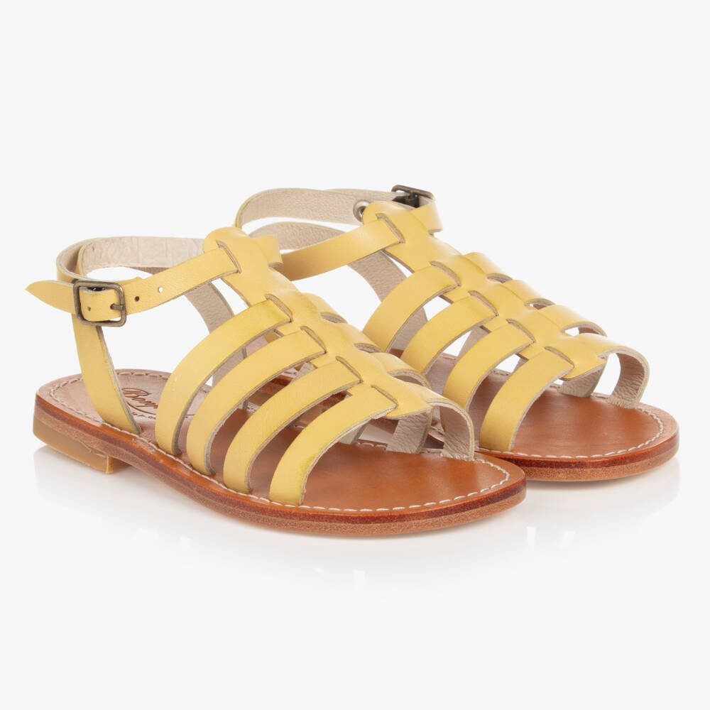 Classic pale yellow leather sandals for girls from French luxury brand Bonpoint. Beautifully simple, these premium sandals have a gladiator style design, with a buckle fastening cross-over ankle strap for a secure fit. The footbed is made in soft leather similarly to the outer sole, which also has rubber patches for enhanced grip.