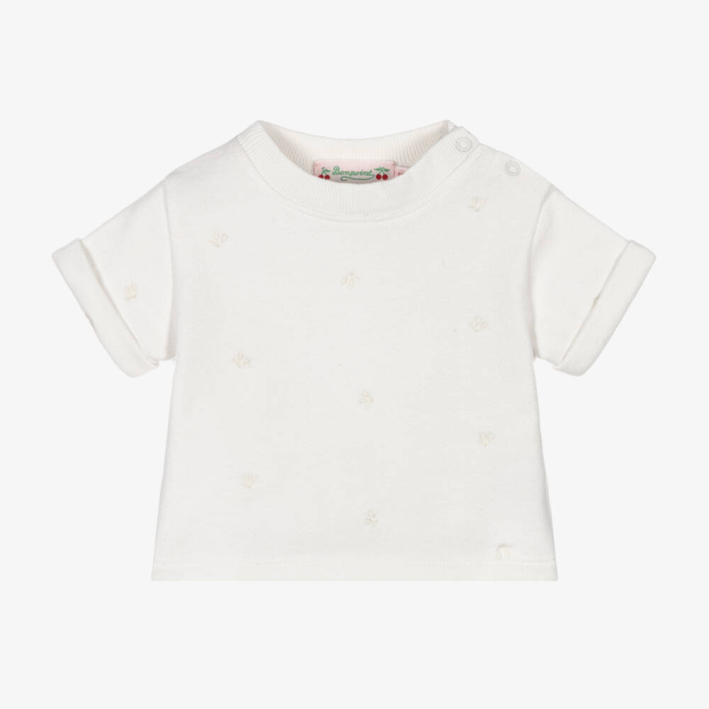 Ivory short-sleeved sweatshirt for little boys and girls by luxury French brand Bonpoint. Made in soft, mid-weight cotton jersey, this cosy piece has turn-up cuffs, a ribbed neckline and useful popper fastenings on one shoulder. It is beautifully embroidered with the designer's iconic little cherry motifs.