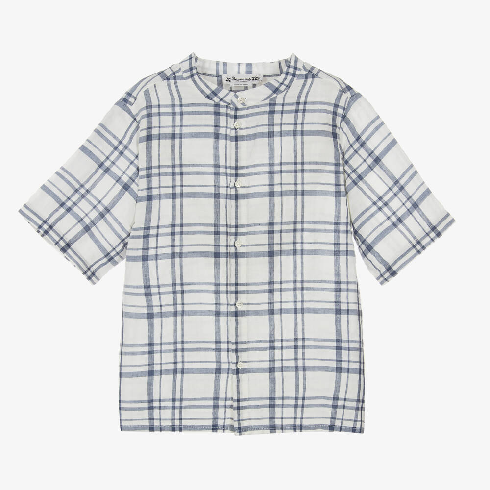 Blue and white check shirt for teen boys by luxury French designer Bonpoint. Made in a soft linen and cotton blend, this lightweight top has a collarless neckline and front button fastenings for casual, easy wear.