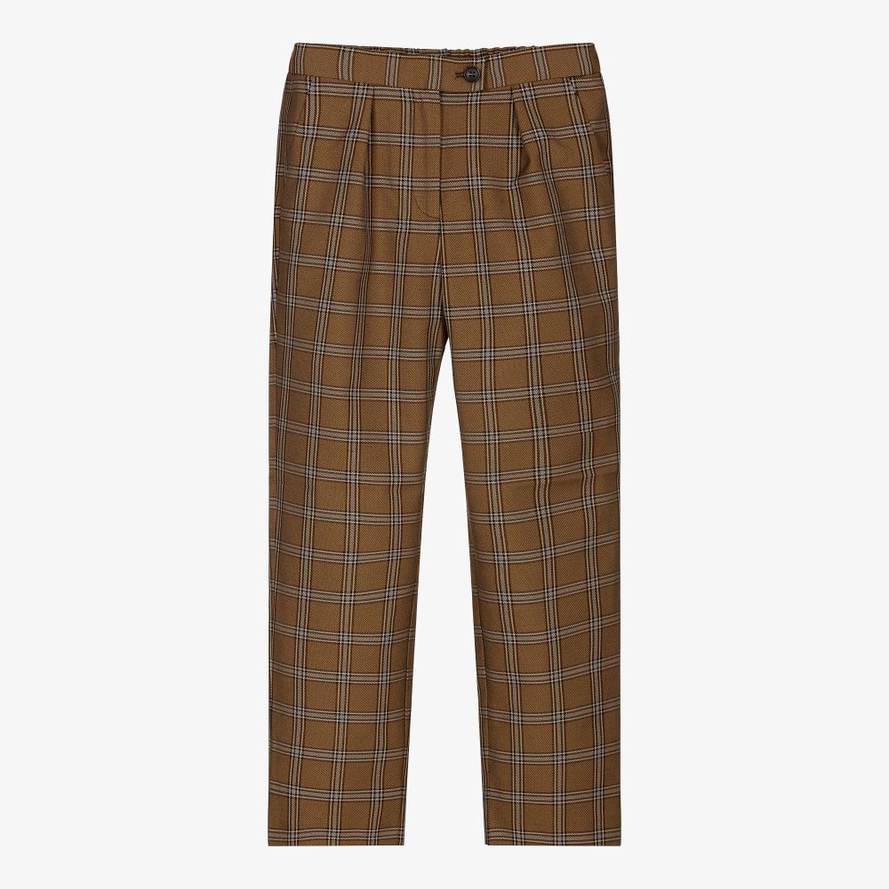 Smart brown check trousers for teen girls by luxury French brand Bonpoint. Made in mid-weight polycotton, these timeless trousers have pleats on the front, slanted side pockets, and tapered legs. They have a partly elasticated waistband, and fasten with a zip and button.