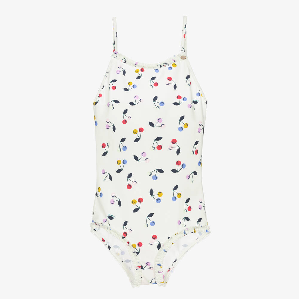 This ivory swimsuit for teen girls is designed by luxury brand Bonpoint. An iconic symbol of the label, the fabric is decorated with cherries in muted colours, and a mother-of-pearl cherry logo charm is stitched on the neckline. Script branding can be found amongst the pattern for a subtle designer detail. Silky and stretchy, it has gathered ruffles on the neckline and hem, a scooped back design and adjustable straps for a comfortable fit.