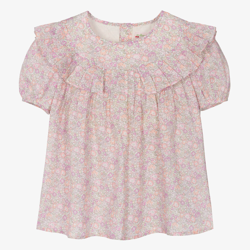 A romantic pink floral blouse for teen girls by French designer Bonpoint, with a beautiful Liberty print. It has a feminine, pleated ruffle around the bodice, with pin tucks below and prettily puffed, short sleeves. Ideal for warm days, it is made in super soft, organic, Tana Lawn cotton™ and fastens on the back with white buttons.