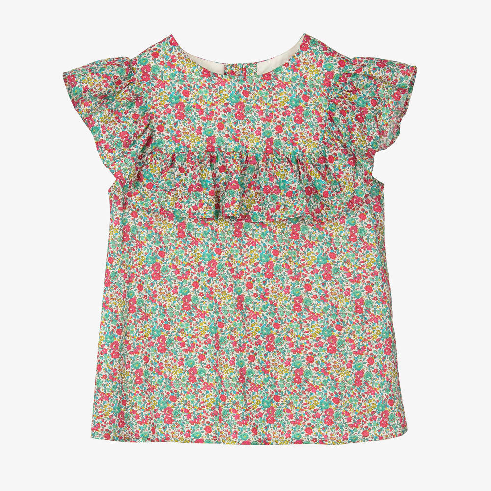 A pretty red and green ditsy floral blouse for teen girls by luxury French brand Bonpoint, designed in a colourful Liberty print. Made in soft organic Tana Lawn cotton, this lightweight top has a ruffle detail for a feminine look, as well as dainty button fastenings on the back.