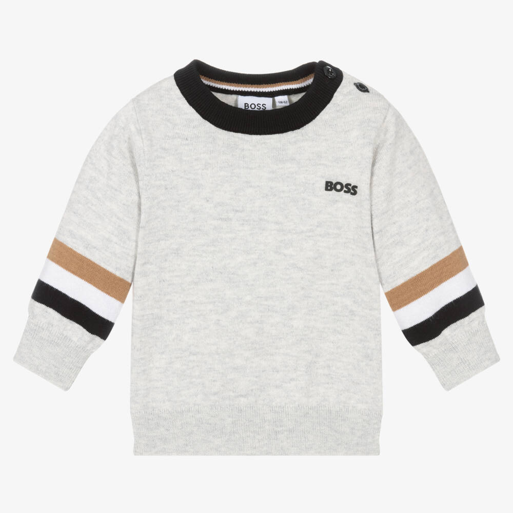 Smart casual sweater for baby boys by BOSS, in a light grey marl cotton and wool blend knit. It has a black rubberised logo on the chest, with beige, white and black accent stripes on both sleeves for extra brand recognition. Soft and cosy, it has a black ribbed neckline with buttons to fasten on one shoulder.