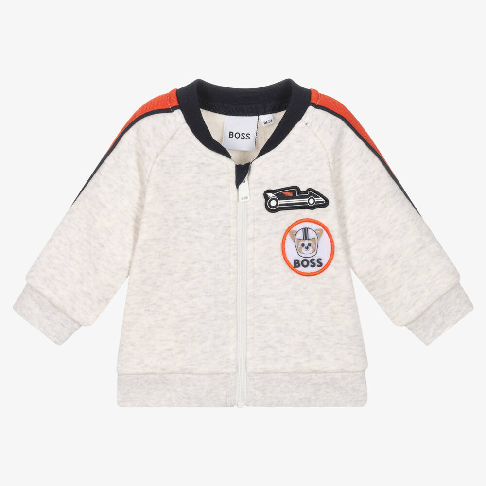 Grey marl zip-up top for baby boys by BOSS, made in soft and mid-weight cotton blend jersey. This cosy and comfortable top has a fleecy underside and an easy-to-use front zip fastener with protective chin guard. For a sporty look, there are navy blue and orange trims and fun logo badges are sewn on the chest for an extra branded touch.