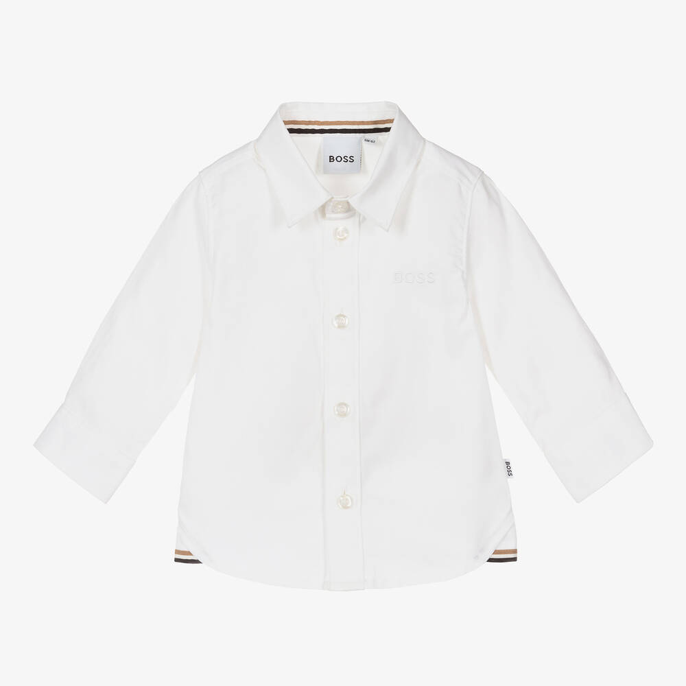 Smart white long-sleeved shirt for baby boys by BOSS, made in soft Oxford cotton. It is discreetly signed with a tonal embroidered logo on the chest and signature striped trims in black, white, and beige on the side vents and inside the collar. It fastens with branded buttons on the front and cuffs.