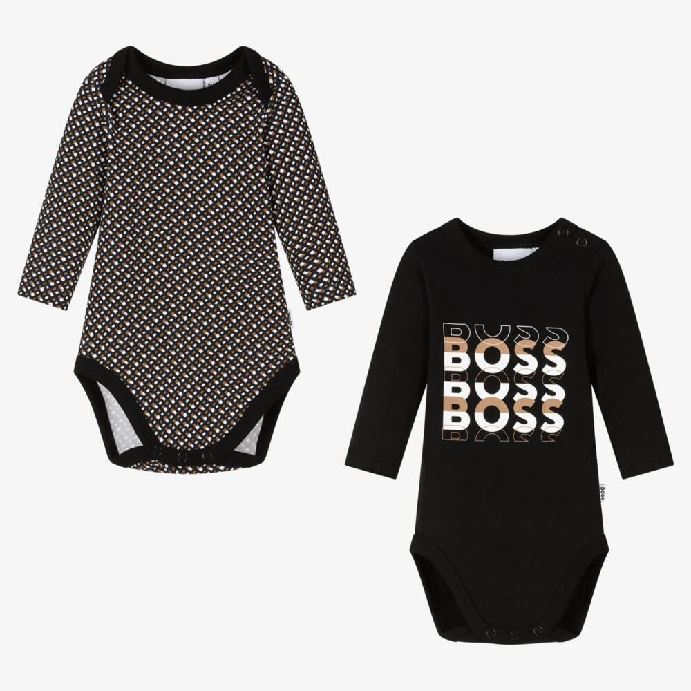 Pack of two black, white and dark beige bodyvests for baby boys and girls by BOSS, made in soft, organic cotton jersey. Instantly recognisable, one is patterned with the iconic tricolour monogram logo, with an envelope neckline. The other has a repeated logo printed on the front in the brand's signature colours. For quick and easy dressing, both bodysuits fasten with poppers between the legs. This garment is made from a minimum of 60% certified material.