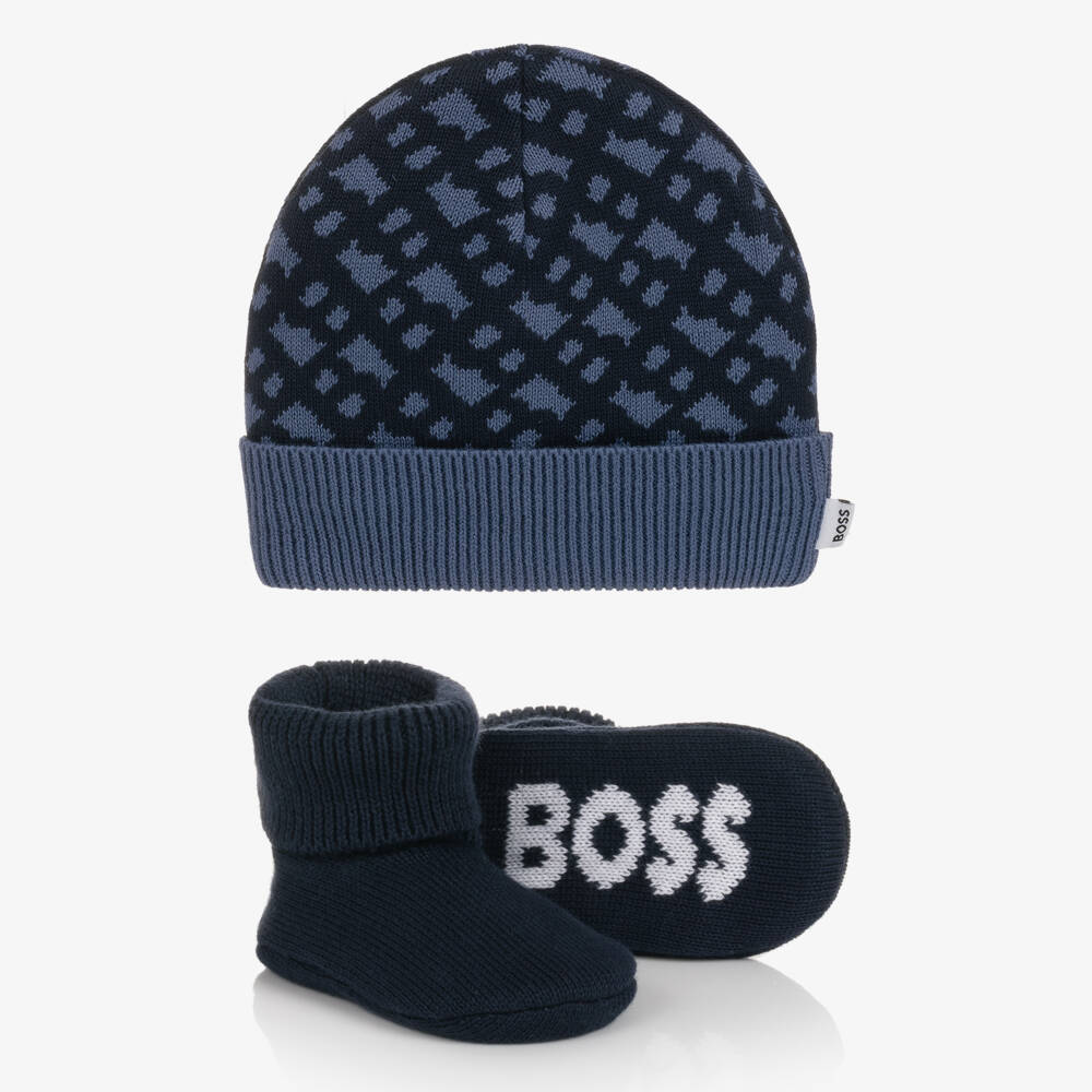 Blue hat and booties set by BOSS for baby boys and girls. Made in a soft cotton knit, the cosy hat is patterned with the designer's monogram logo and has a softly ribbed turn-up brim. For a sweet designer touch, the brand's logo is in white on the bottom of the cute matching booties. This lovely set is presented in a branded box, making it an ideal gift.