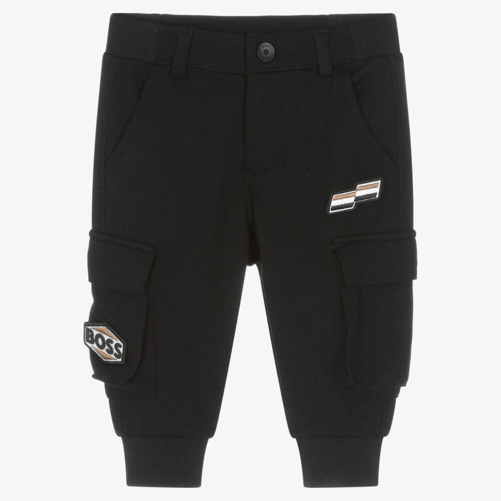 Black joggers for little boys from BOSS, made in soft mid-weight viscose-blend piqué. With a smart twist on a casual design, these comfortable cuffed joggers have pockets on both the front and back, with cargo pockets on the legs. They fasten with a hook and zip on the front and have a comfortable elasticated waistband. For designer appeal, there are logo appliqués on the front with the brand's signature flag tabs on the back.