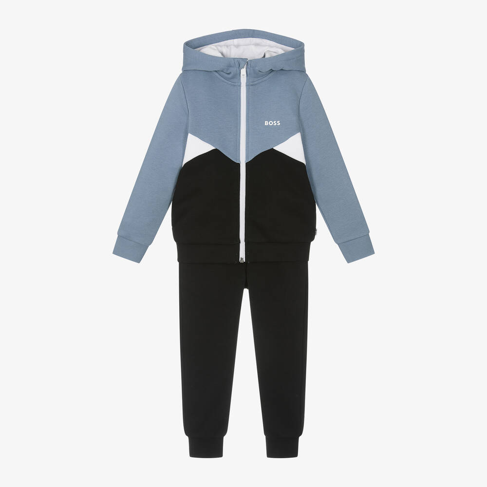 Крутой и удобный спортивный костюм для мальчиков от BOSS в черно-синем и белом цветах из хлопкового трикотажа с мягкой флисовой изнанкой и уютными ребристыми отделками. На топе и брюках есть белый логотип и ярлык для брендового акцента. Топ на молнии с ребристыми отделками, карманами на швах и капюшоном на подкладке из трикотажа. Джоггеры легко надеваются, с манжетами и скрытыми передними карманами.