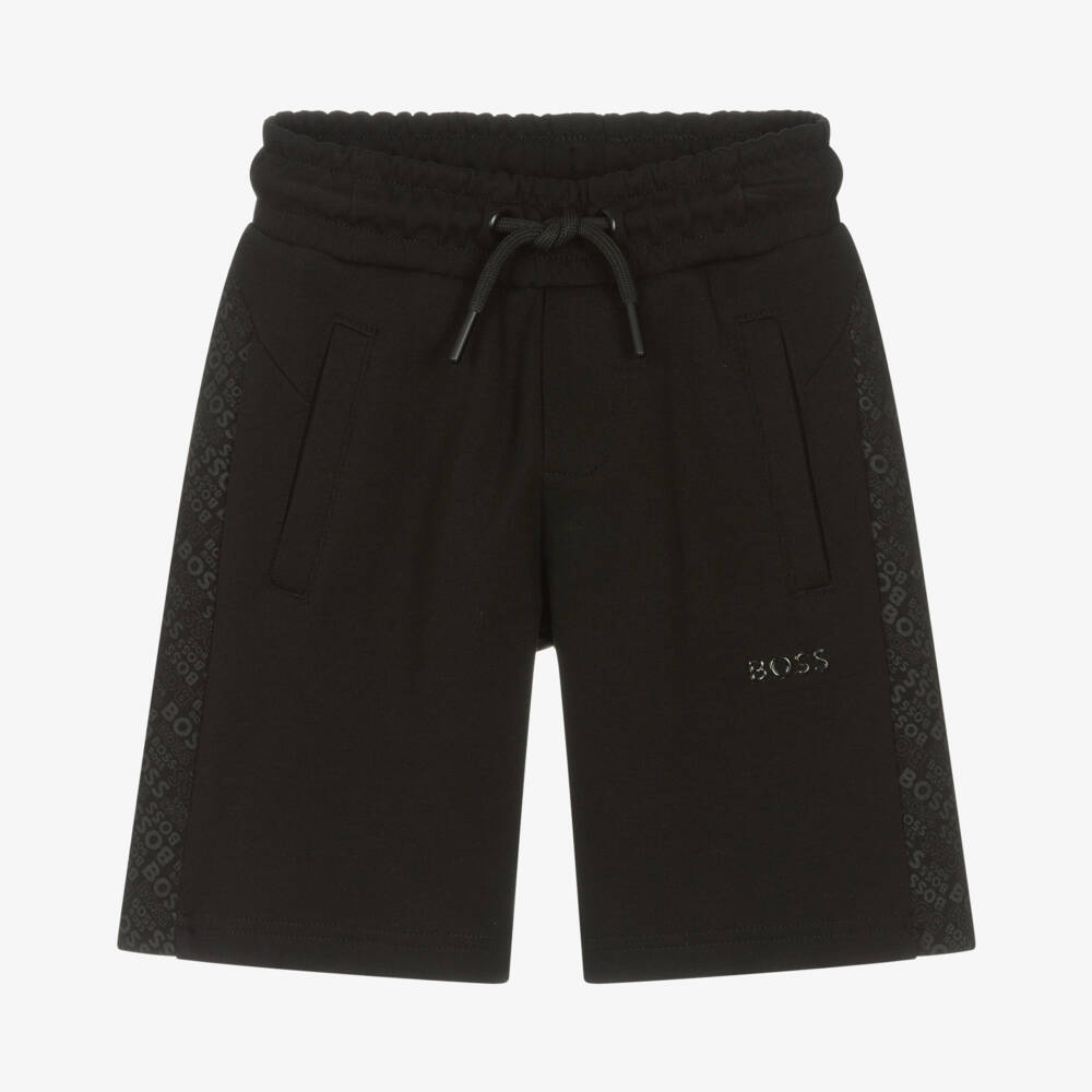 Black cotton Mini-me shorts for boys by German brand BOSS, with a rubberised logo on one leg and logo panels on the sides. Ideal for relaxed days with designer style, they are made in stretchy jersey and have a drawstring waistband for a comfortable fit. There are handy jetted pockets on the front.