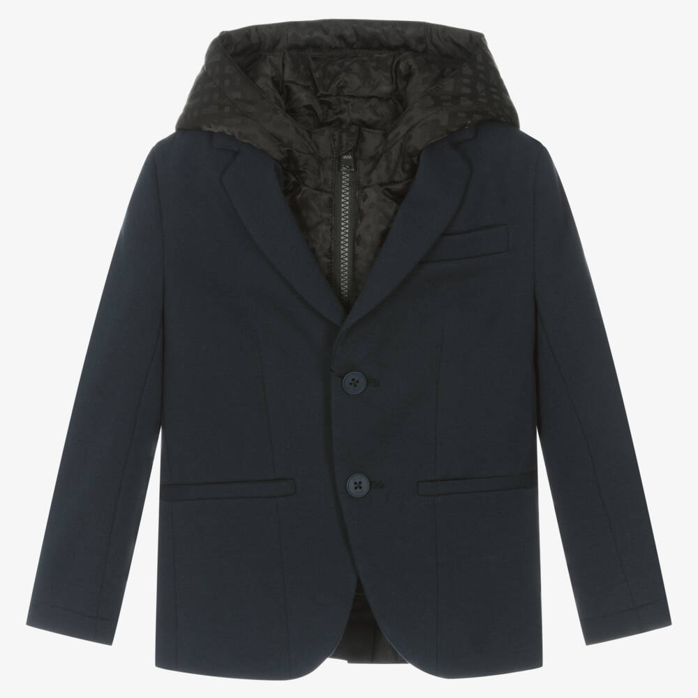 Smart navy blue blazer for boys by stylish German brand BOSS, with a contemporary, detachable, black, hooded insert for cooler days. The tailored cotton jersey jacket is slightly fitted, with faux pockets on the chest and front, and a black satin lining. It fastens with logo buttons and has over-lapping, decorative buttons on the cuffs, adding stylish, designer detailing. The silky satin monogrammed insert is lightly padded and attached with buttons. It fastens with a zip that has a logo pull tab and a chin guard for protection.