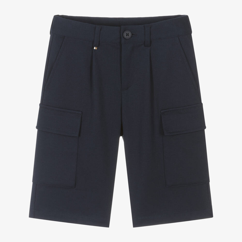 Smart navy blue Milano jersey shorts for boys by BOSS, with cargo pockets. Made in a soft viscose blend, the brand's signature, striped logo tab is on the waistband, which is adjustable for smaller sizes. Bermuda length, they have both front and back pockets.