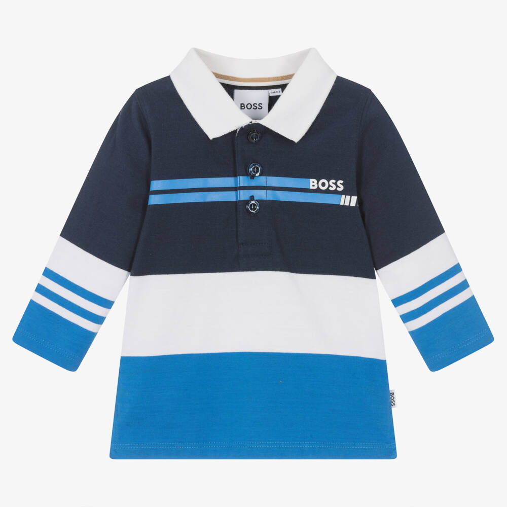 In striped shades of blue and white, this long-sleeved polo shirt for little boys is from BOSS. Made in soft and comfortable cotton jersey with a split hem for comfortable wear and logo tab on side seam, it has a white logo print on the chest and branded button fastenings.