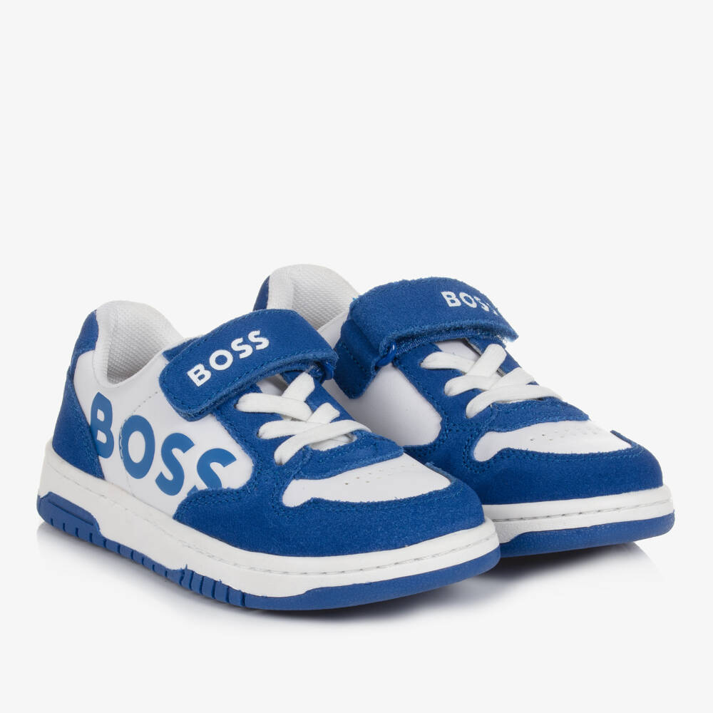 White faux leather trainers for boys by BOSS, with blue suede trims and velcro fastening. Lined in padded textile, the brand name can be seen in blue on the side, as well as in white on the front and the heel. Complete with a non-slip rubber outsole, these trainers have faux elasticated lace detailing and a breathable, perforated panel on the toe.