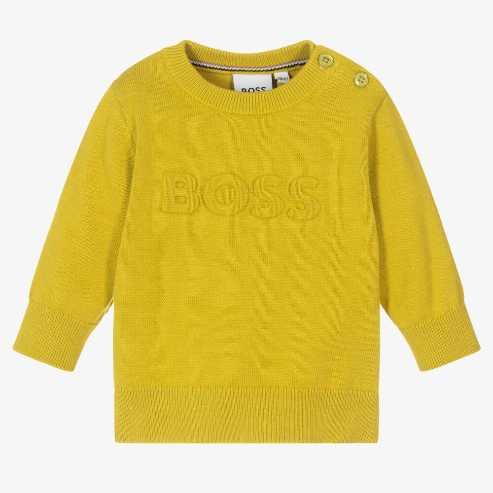 Lovely lime green sweater for little boys by BOSS, with an embossed logo on the front. It is knitted in soft cotton yarn with ribbed trims and branded button fastening one shoulder.