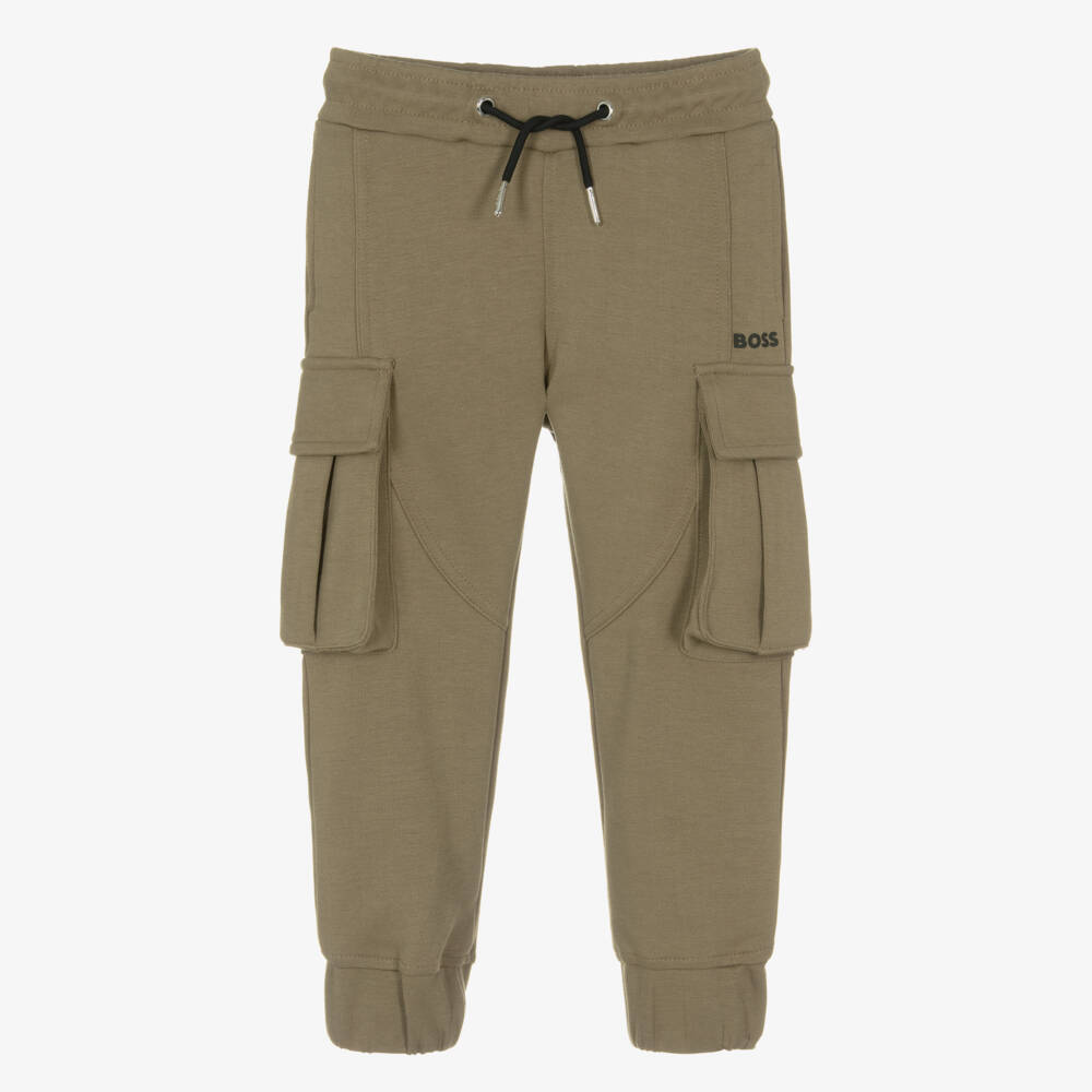 Khaki green joggers for boys by BOSS, made in soft mid-weight cotton-blend jersey. In a cool utility-inspired design, they have a black BOSS logo printed on the front, with signature detailing on the back pocket. Comfortable to wear, they have an elasticated waistband with branded drawstring ties for an adjustable fit. There are useful side seam pockets, as well as cargo-style pockets on the legs, secured with popper fastenings.