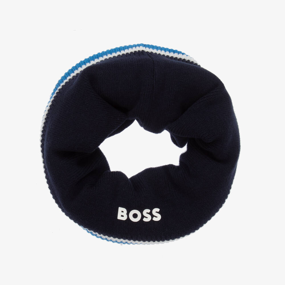 A navy blue cotton snood for little boys by BOSS, knitted with bright blue and white stripes. For a distinctive look, it has a bold rubberised logo on the front. The lining is made from super soft velour, designed to keep the head, face and neck warm.