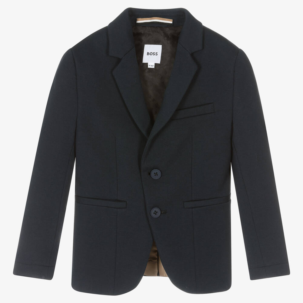 Navy blue blazer for boys by BOSS, made in mid-weight Milano jersey. Great for smart-casual wear, this tailored blazer has notched lapels, single-breasted button fastenings and decorative buttons on the cuffs. There are faux pockets on the front for a formal look. It has a functional pocket on the inside and is finished with a silky smooth monogram lining.
