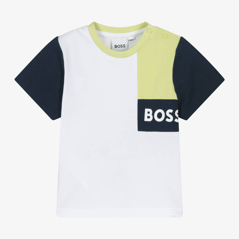 Стильная футболка для малышей от BOSS из белого хлопка. Эта мягкая футболка из пике имеет яркие цветные блоки в синем и зеленом цветах, привлекающие внимание, с логотипом бренда на груди для мгновенного узнавания. Кнопки на одном плече облегчают одевание.