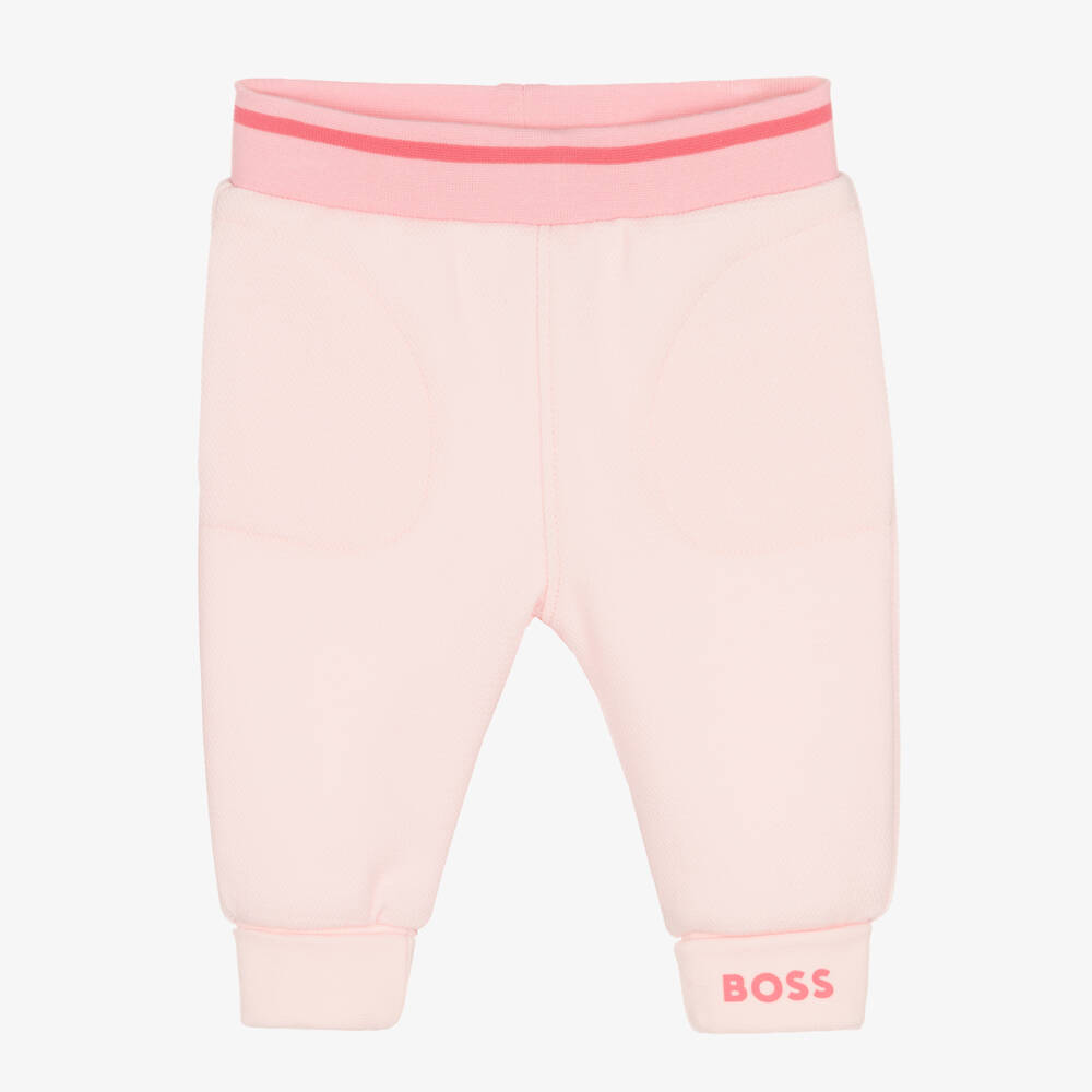 Casual pale pink joggers for little girls by BOSS, made from soft organic cotton piqué. Delicate on the body, there is a dark pink elasticated waistband, with cosy side seam pockets beneath. The brand's signature logo is printed on the turn-up hem for a relaxed designer finish.