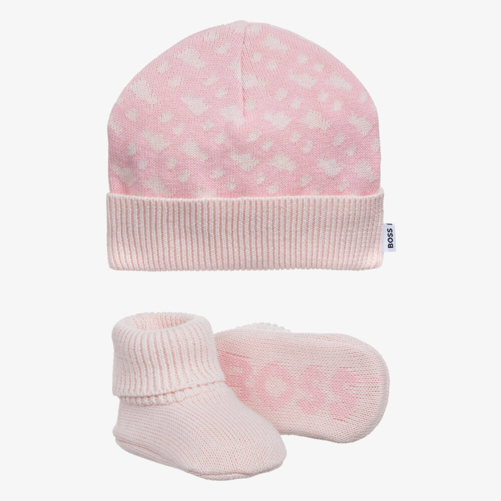 Pink hat and booties set by BOSS for baby girls. Made in a soft cotton knit, the cosy hat is patterned with the designer's monogram logo and has a softly ribbed turn-up brim. For a sweet designer touch, the brand's logo is on the bottom of the cute matching booties. This lovely set is presented in a branded box, making it an ideal gift.