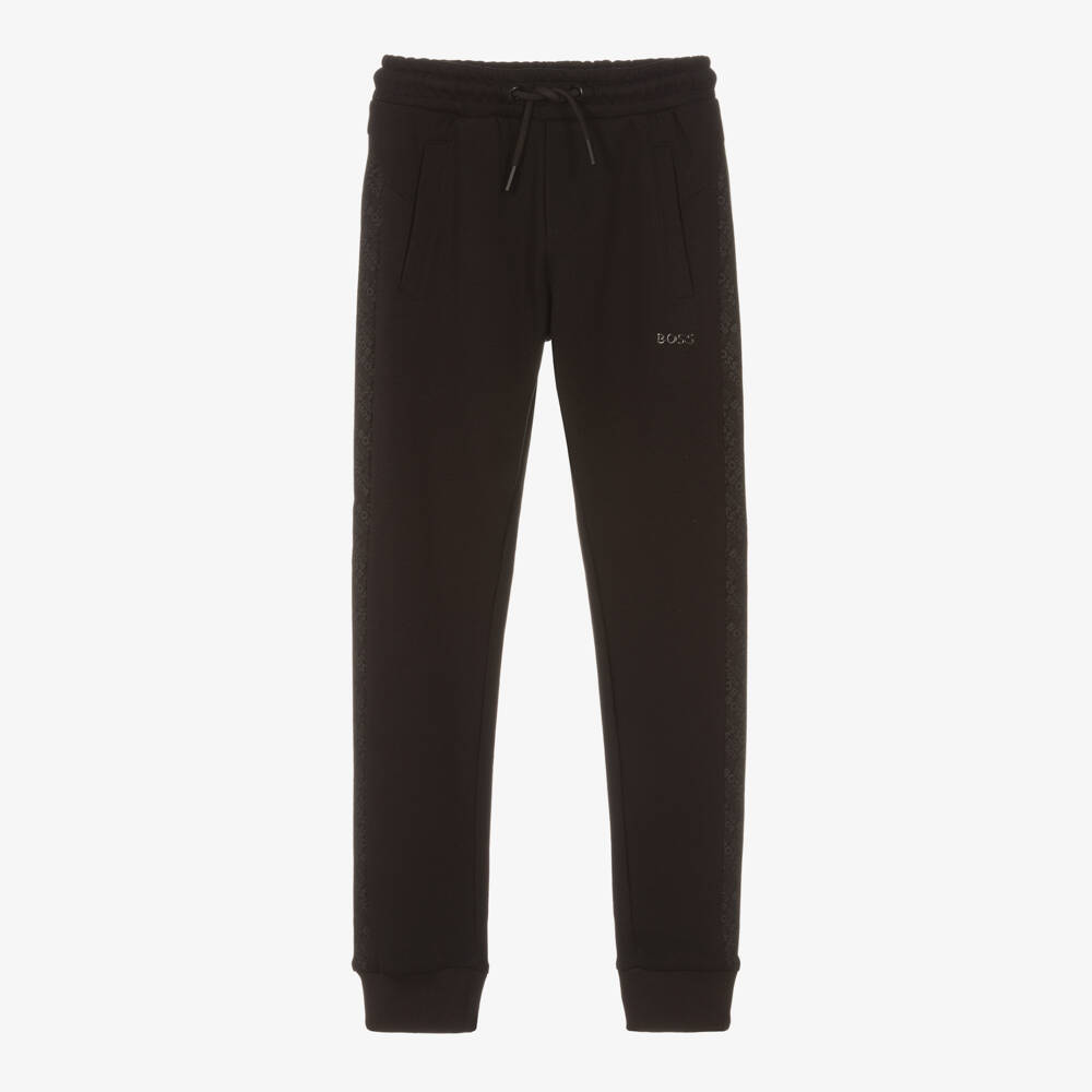 Black cotton Mini-me joggers for teen boys by BOSS, with a tonal rubberised logo on one leg for brand identity. Made in stretchy jersey, these casual bottoms have patterned panels on the legs, highlighted with repeated logos. The drawstring waist allows for an adjustable fit and the jetted pockets on the front are great for storing everyday essentials. They are finished with neat, ribbed cuffs for a classic look.