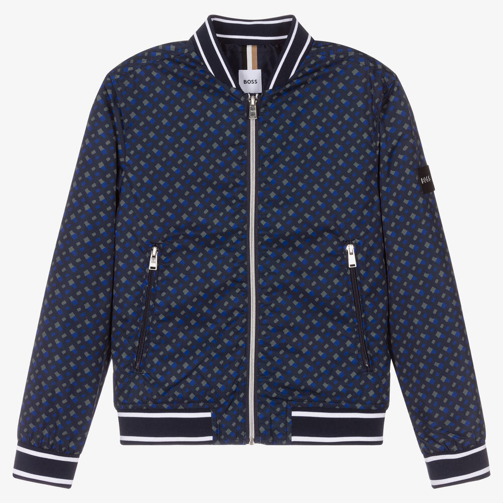 Make a fashion-forward statement in this navy blue and khaki green bomber jacket for teen boys from BOSS. Made and lined in silky-smooth, water-repellent fabric, this lightweight outerwear piece has striped trims and an all-over monogram print for a cool branded look. Zip fastenings on the front and side pockets are engraved with the German label's branding, and a black logo patch is appliquéd on one sleeve for extra designer allure. A tricolour tab in beige, white and black is stitched on the back of the neckline to complete the style.