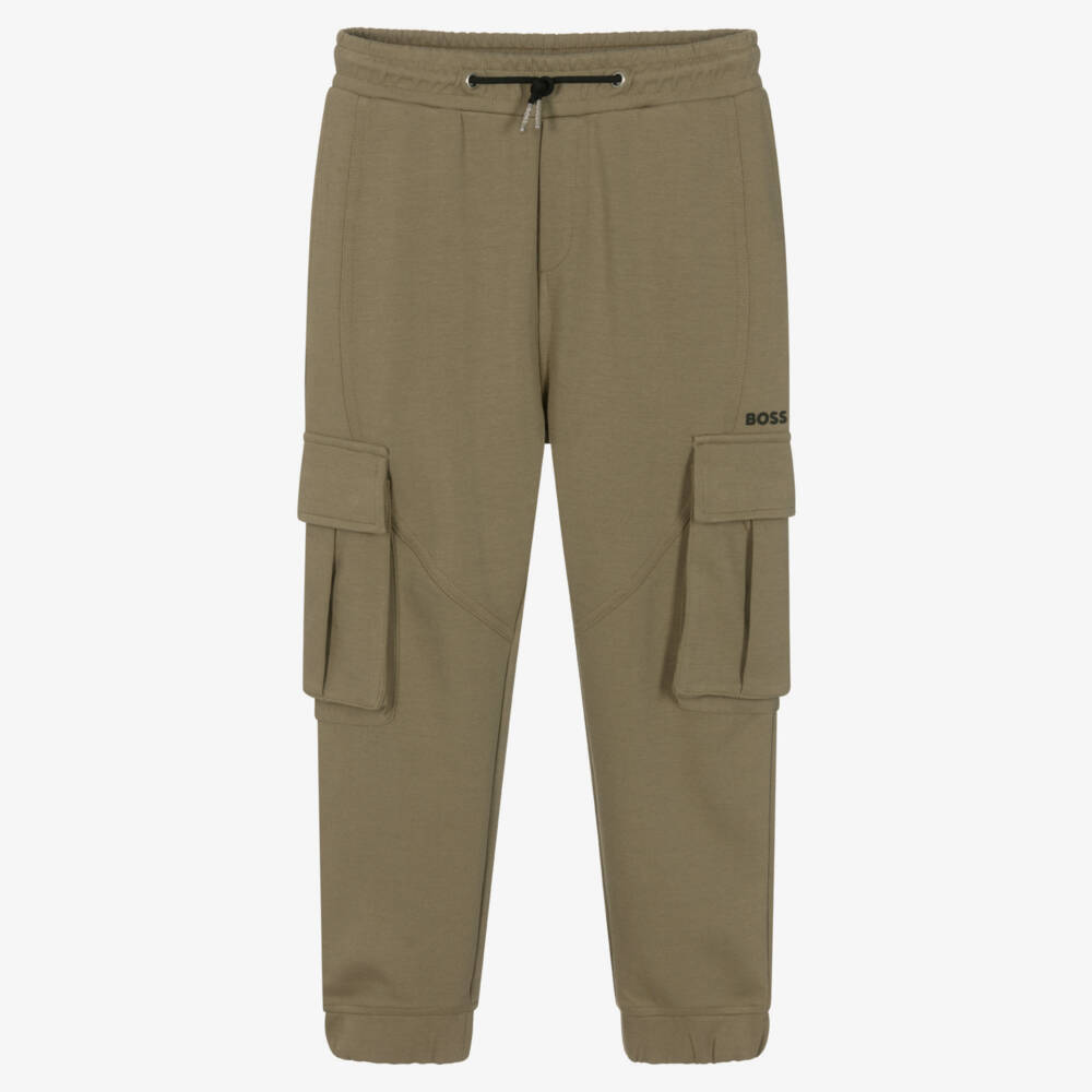 Khaki green cargo-style joggers for teen boys by BOSS, in a cool utility-inspired design. Subtly branded, these cotton jersey joggers have a black BOSS logo printed on the front, with signature tricolour stripe detailing on the back pocket. The drawstring waistband, side seam pockets and popper fastening cargo pockets offer a low-key finish.