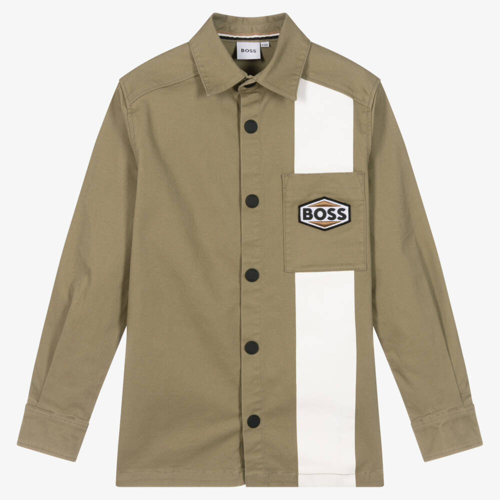 A khaki green overshirt for teen boys from BOSS, as seen in the adult collection. Designed with a cool utility aesthetic, this cool layering piece has a white stripe graphic from the shoulder to the hem, a classic pointed collar and matte black branded poppers. In the designer's signature colours, a beige, black and white embroidered logo patch can be found on the front pocket. It is made in soft, heavier-weight cotton twill with added stretch for comfort and a structured fit.