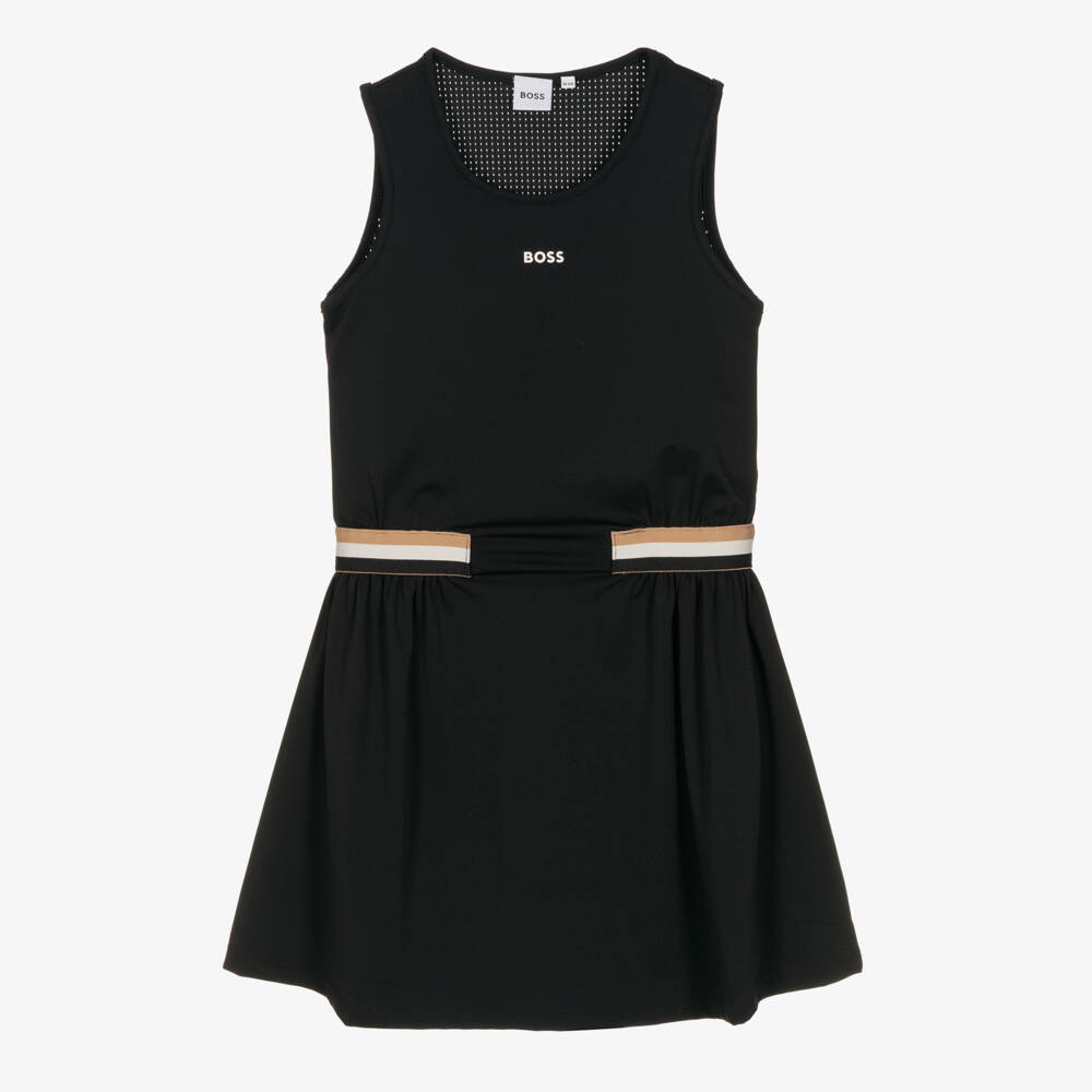 Black dress for teen girls by German brand BOSS. Designer details include a white logo stamped on the front and the label's signature tricolour branding on the stylish dropped waist. Great for warmer weather, this sporty, sleeveless piece is made in silky and stretchy lycra, with a breathable mesh panel on the back of the bodice to keep her cool and comfortable.