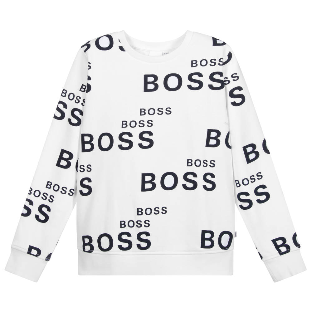 Teen boys white cotton jersey sweatshirt by BOSS Kidswear. As seen in the main collection, it has a very dark navy blue logo pattern. Create a modern, bold logo look with this easy-wear piece.
