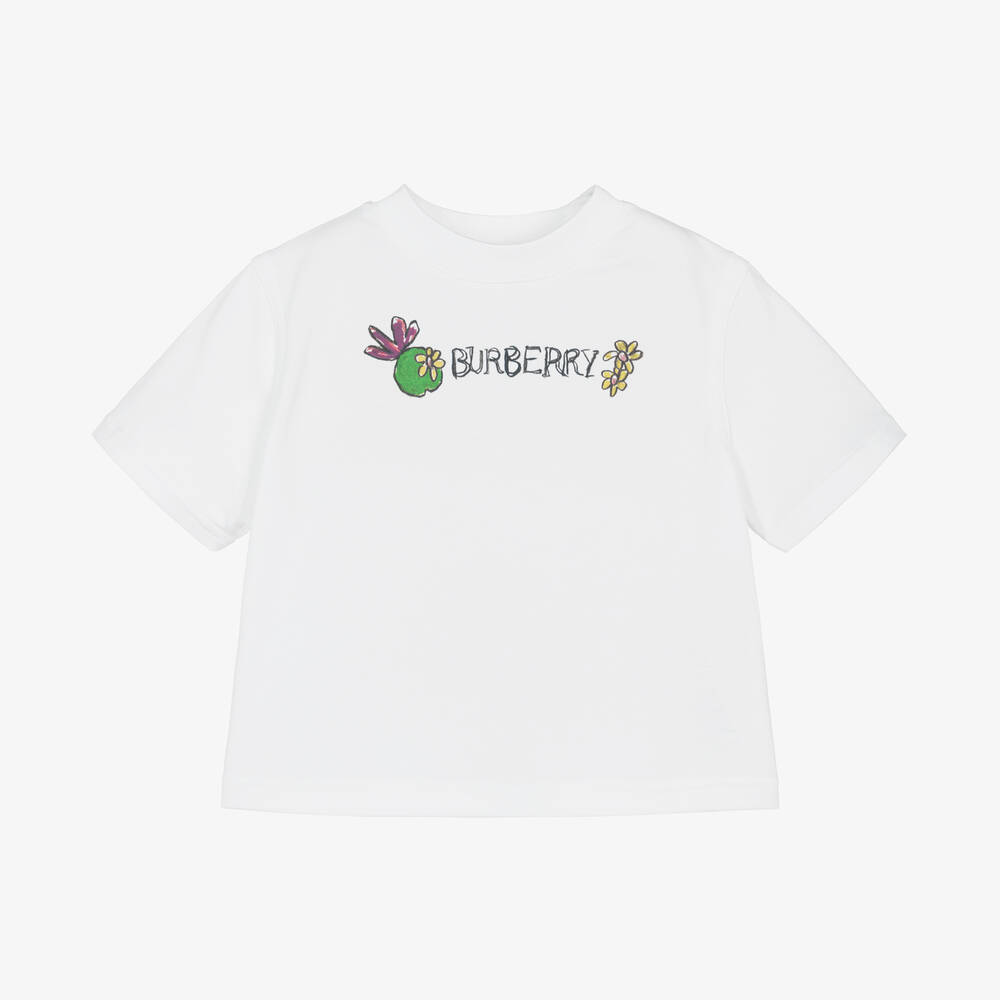 White cotton jersey T-shirt for baby girls by luxury British fashion house Burberry. The front has a pretty floral pond illustration in green, yellow and pink, with the designer's name for brand recognition. This casual tee has short sleeves and shoulder popper fastenings to assist with dressing. This product contains organic cotton.