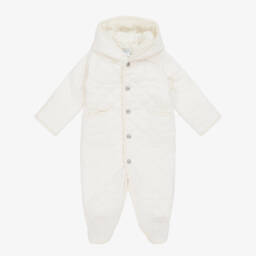 A beige fleece pramsuit for baby boys and girls, by luxury designer Burberry. Patterned with the Burberry Check, this hooded style is comfortably lined and fastens with a B-cut zip pull on the front. Smaller sizes are designed with integrated scratch mitts and booties for extra cosiness.