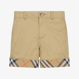 Элегантные повседневные бежевые шорты для мальчиков от Burberry из комфортного хлопкового твила. Эти универсальные шорты имеют отвороты с фирменной клеткой Burberry и оранжевыми акцентами. Оснащены косыми передними карманами, одним задним карманом и полуэластичным поясом для плотной посадки. Застегиваются на молнию и пуговицу, есть удобные шлевки для ремня.