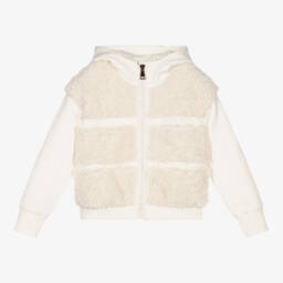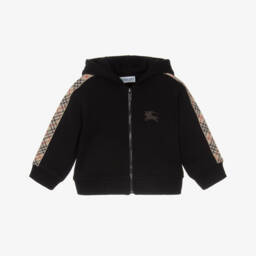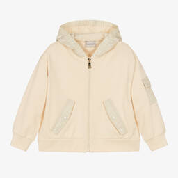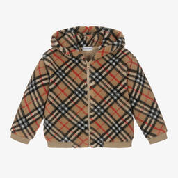 An Archive beige zip-up hooded top for boys by luxury British designer Burberry, made in soft borg fleece. Instantly recognisable, it is designed in the brand's iconic Vintage check with a soft mesh lining for added comfort. Ideal casual wear on cooler days, it has long sleeves and stretchy ribbed trims. There are concealed side seam pockets and a neat zip fastening on the front.