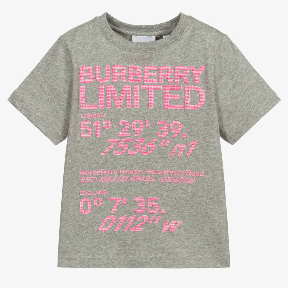 A grey marl T-shirt for girls by luxury brand Burberry, made in soft, stretchy cotton jersey. It has the bright pink rubberised 'Burberry Limited' logo print on the front with the geographical coordinates of the brand's global HQ in London.