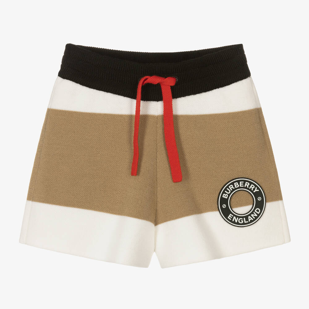 Luxury Merino wool shorts for baby boys by Burberry, styled in the designer's classic Icon stripe. Featuring bold colours of ivory, beige, red and black, they have an adjustable drawstring waist and a logo patch on one leg. Responsibly sourced wool.