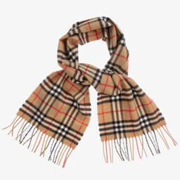 Mini-me, cosy light beige cashmere scarf for boys and girls by British label Burberry, capturing the luxury brand's heritage style. Woven using traditional looms at a 200 year old Scottish mill, this beautifully soft scarf showcases the iconic Burberry Check and adds designer flair to any outfit.
