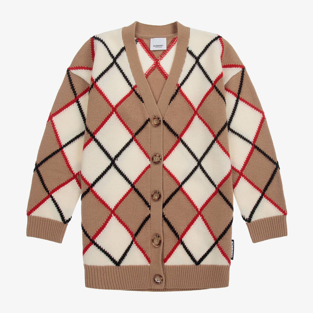 Teen girls long cardigan by luxury brand Burberry, knitted in a soft wool and cashmere blend. Patterned with a camel beige, ivory and red argyle design, it has horn button fastenings. There are ribbed trims and a black rubberised logo tab on one side.