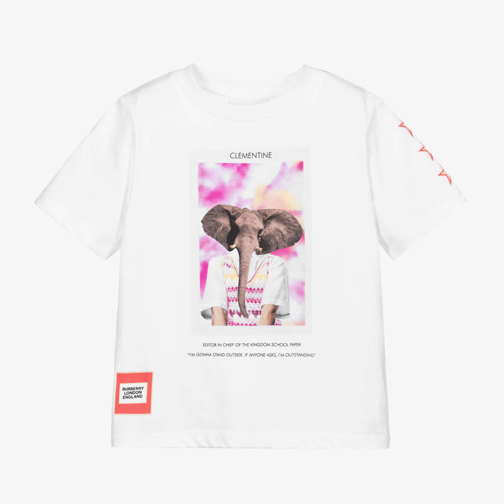 Girls white T-shirt from luxury brand Burberry, made in soft cotton jersey. It has a print of an elephant on the front, and pink and beige logos and stars on the back and sleeve.